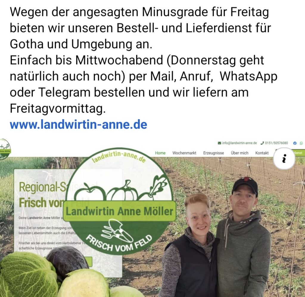 Auf unserem fast 3 Hektar großen Feld in Herbsleben bauen wir leckeres, regionales Obst- und Gemüse an, das wir auch gern zu Dir nach Hause bringen.
